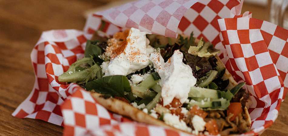 Our gyro is made with thinly sliced lamb and beef, organic greens, tomatoes, and cucumbers, on a warmed pita. Then it is topped with feta cheese and our custom tzatziki sauce.