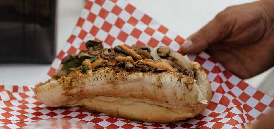 The Vegetarian Steak is made with extra grilled peppers, mushrooms, and onions and smothered with provolone cheese on a handcrafted Amoroso-style roll.